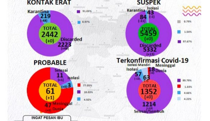 “Kasus terkonfirmasi Covid-19 total 1.352 orang. 63 orang masih melakukan isolasi mandiri, 57 orang diisolasi, 1.214 orang dinyatakan sembuh, dan 18 orang meninggal dunia,” pungkasnya.