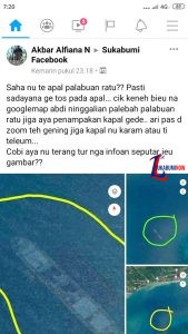 “Saha nu te apal palabuan ratu?? Pasti sadayana ge tos pada apal… cik keneh bieu na googlemap abdi ninggalian palebah palabuan ratu jiga aya penampakan kapal gede.. ari pas d zoom teh gening jiga kapal nu karam atau ti teleum…