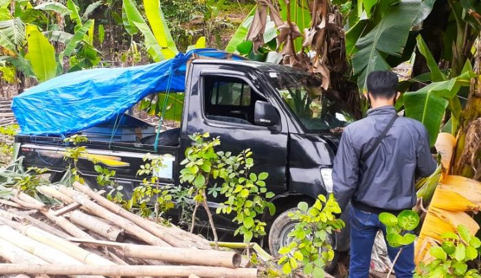 Sukabuminow.com || Mobil pikap pedagang tahu bulat bernomor polisi B 9041 KAS, terperosok dan menabrak pohon pisang di pinggir Jalan Jajaway, Desa Citepus, Kecamatan Palabuhanratu, Kabupaten Sukabumi, Jawa Barat, Rabu (17/2/21).