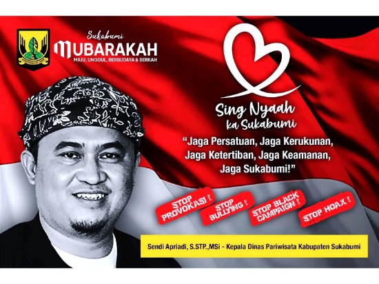 Kepala Dinas Pariwisata Kabupaten Sukabumi, Sendi Apriadi, menegaskan pentingnya menjaga persatuan, kerukunan, ketertiban, dan keamanan di tengah dinamika yang berkembang. Hal itu ia sampaikan melalui sebuah pesan visual yang menekankan makna persatuan untuk membangun Sukabumi yang maju, unggul, berbudaya, dan berkah.