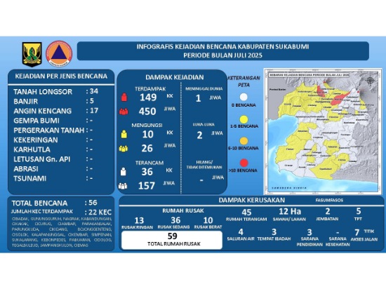 Sukabuminow.com || Bulan Juli 2025 menjadi periode yang penuh tantangan bagi masyarakat Kabupaten Sukabumi. Berdasarkan data Badan Penanggulangan Bencana Daerah (BPBD), sepanjang bulan tersebut terjadi 56 kejadian bencana yang tersebar di 22 kecamatan.