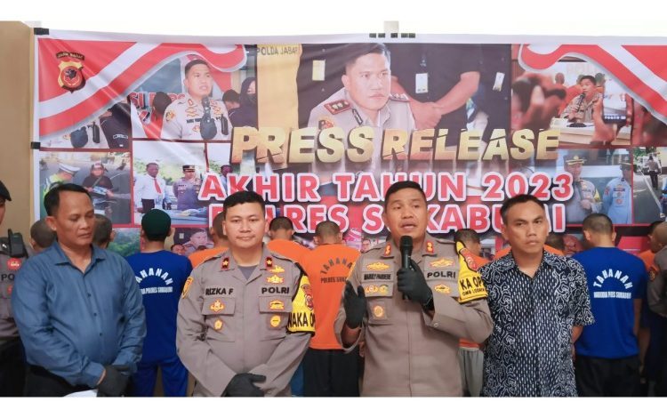 Sukabuminow.com || Kasus kriminal di wilayah hukum Polres Sukabumi mengalami penurunan selama tahun 2023 ini. Hal itu terungkap dalam konferensi pers yang digelar Kapolres Sukabumi, AKBP Maruly Pardede, di Gedung Pujasera Prikompol Polres Sukabumi, Jumat (29/12/23).