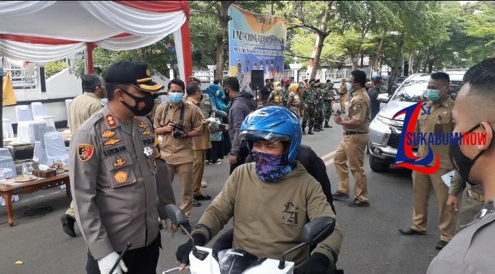 Sukabuminow.com|| Kapolres Sukabumi AKBP M. Lukman Syarif mengapresiasi Program Gebrak Masker yang dilaunching Pemerintah Kabupaten Sukabumi di Jalan Siliwangi, Palabuhanratu, Senin (23/11/20).