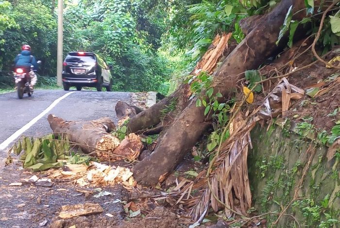 Pantauan di lapangan, pohon roboh tepat di atas tebing dan sebagaian batang menjulur ke jalan dan mengahalangi setengah badan jalan ruas Palabuharatu – Cikidang tersebut.