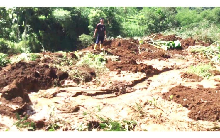 Sukabuminow.com || Puluhan petak sawah dan sumber air bersih di Kampung Pasir Jengjeng RT 01/10, Desa Babakan Panjang, Kecamatan Nagrak, Kabupaten Sukabumi, tertimbun tanah longsor Sabtu (18/2/23).