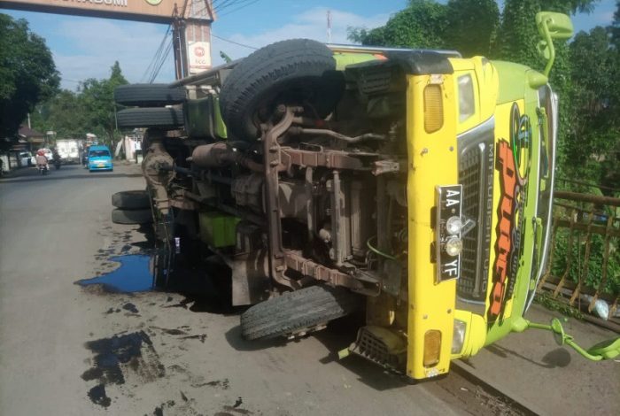 Berdasarkan informasi yang dihimpun, truk tersebut mengalami patah as roda kiri sehingga terguling ke arah kiri sekitar pukul 6.30 pagi.