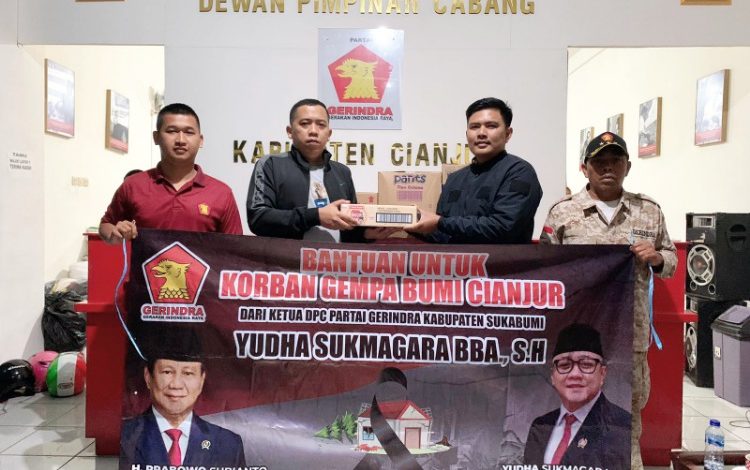 “Bantuan yang kita dorong berupa makanan untuk balita dan para lansia. Semua kami salurkan melalui DPC Partai Gerindra Kabupaten Cianjur. Pendistribusiannya di wakili oleh kader Gerindra Masa Depan (GMD) Partai Gerindra serta Laskar Garuda Partai Gerindra,” terang Ketua DPC Partai Gerindra Kabupaten Sukabumi, Yudha Sukmagara.