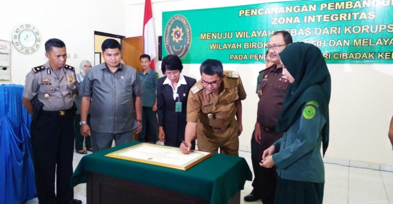 Komitmen tersebut ditandai dengan Pencanangan Pembangunan Zona Integritas Menuju Wilayah Bebas Korupsi (WBK) dan Wilayah Birokrasi Bersih dan Melayani (WBBM) pada Pengadilan Negeri Cibadak Kelas 1 B dilakukan di Ruang Sidang II PN Cibadak, Senin (11/3/19).