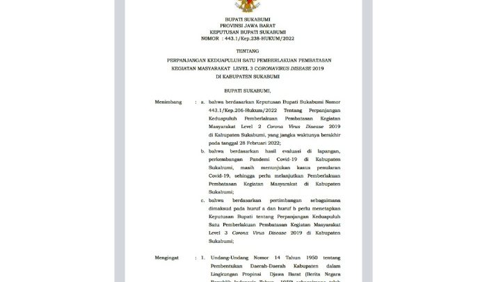 Dalam SK tersebut, tertulis bahwa PPKM Level 3 di Kabupaten Sukabumi berlaku mulai 1 Maret 2022 hingga 7 Maret 2022. Dalam SK yang juga ditandangani Kepala Bagian Hukum Setda, Boyke Martadinata tersebut disebutkan, PPKM dapat diperpanjang apabila penyebaran Covid-19 belum dapat dikendalikan secara optimal.