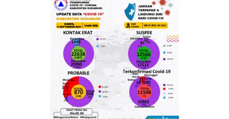 Sukabuminow.com || Angka kesembuhan Covid-19 di Kabupaten Sukabumi kini mencapai 10963 dari total 11598 kasus. Terbaru, 23 pasien sembuh berdasarkan data yang dirilis Pusat Informasi dan Koordinasi Covid-19 Kabupaten Sukabumi (Pikokami), Kamis (9/9/21).