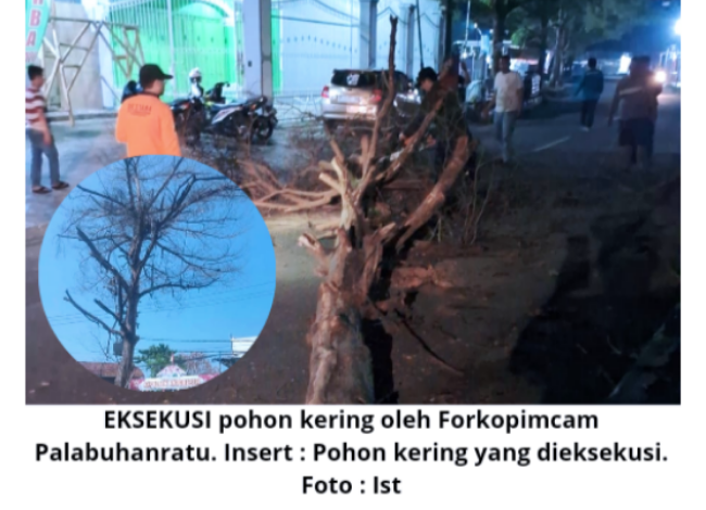 Sukabuminow.com || Forum Komunikasi Pimpinan Kecamatan (Forkopimcam) Palabuhanratu, Kabupaten Sukabumi, Jawa Barat, menjawab keresahan warga pengguna jalan terkait keberadaan pohon kering di Jalan Pangsor Palabuhanratu. Langkah cepat diambil dengan menebang pohon tersebut.