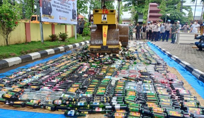 Sukabuminow.com || Operasi Cipta Kondisi yang digelar Polres Sukabumi menyita ribuan botol minuman beralkohol dari berbagai titik di Kabupaten Sukabumi. Ribuan botol mihol tersebut dimusnahkan dengan alat berat jenis stum di Mapolres Sukabumi, Jumat (1/4/22).