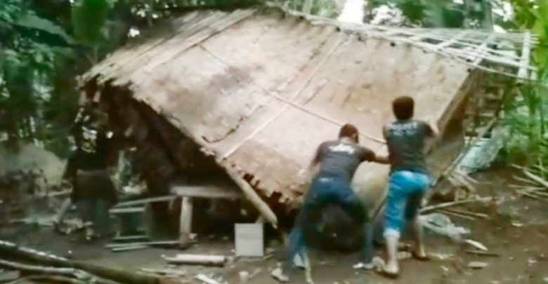Sukabuminow.com || Pemilik rumah miring di Kampung Tangkil RT 04/01, Desa Tangkil, Kecamatan Cidahu, Kabupaten Sukabumi, Abah Oji (75), hanya bisa pasrah saat para relawan merobohkan rumah yang selama ini ditempatinya, Senin (26/3/19). Ia bersama Mak Adah (70), istri tercintanya, sementara ini mengungsi ke rumah kerabatnya.