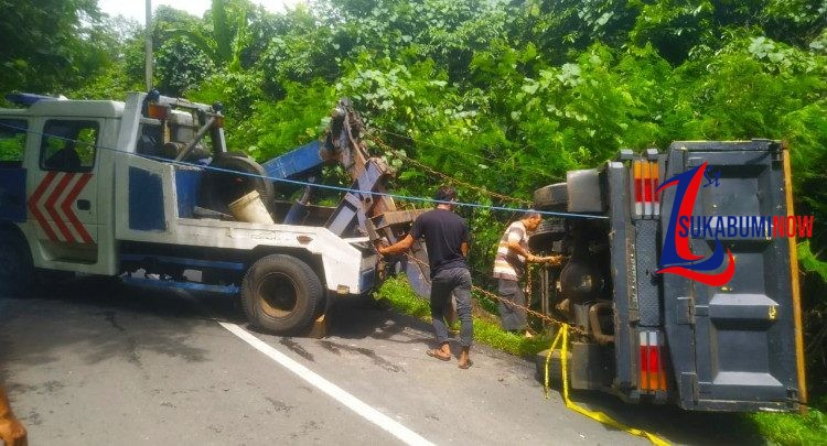 Sukabuminow.com || Truk engkel F 8550 OL yang terguling di jalanan menurun Cisarakan, Desa Buniwangi, Kecamatan Palabuhanratu, Selasa (7/1/20), berhasil dievakuasi Unit Laka Lantas Polres Sukabumi.