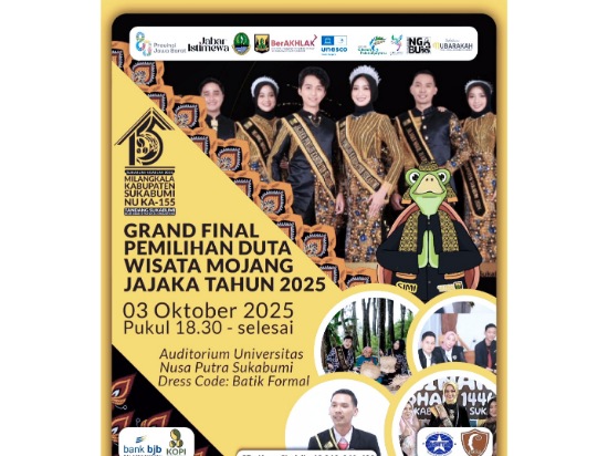 Sukabuminow.com || Setelah sempat mengalami penundaan, ajang Grand Final Pemilihan Duta Wisata Mojang Jajaka Kabupaten Sukabumi 2025 akhirnya akan digelar pada Jumat (3/10/25). Acara ini akan berlangsung di Auditorium Universitas Nusa Putra Sukabumi mulai pukul 18.30 WIB hingga selesai, dengan dress code batik formal.