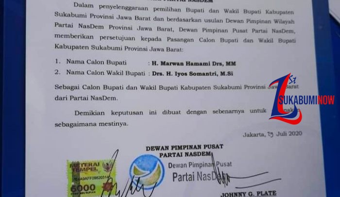 SK DPP NasDem bernomor 105-Kpts/DPP NasDem/VII/2020 tentang Persetujuan Pasangan Calon Bupati dan Wakil Bupati Kabupaten Sukabumi Provinsi Jawa Barat dari Partai NasDem, ditandatangani langsung oleh Ketum DPP Surya Paloh dan Sekjen Johnny G Plate, tertanggal 29 Juli 2020.