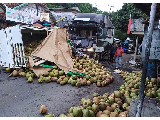 Benturan keras menyebabkan kedua kendaraan berhenti di badan jalan, sementara muatan kelapa dari truk Fuso berserakan di aspal. Kondisi tersebut membuat arus lalu lintas dari dua arah sempat mengalami kemacetan cukup panjang.