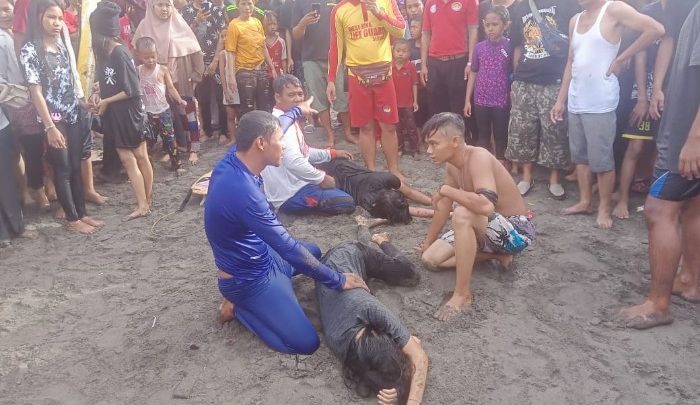 Sukabuminow.com || 10 wisatawan yang tengah berenang di lepas Pantai Karanghawu Kebon Kalapa 2, Cisolok, terseret arus, Minggu (27/3/22). Peristiwa itu terjadi diduga akibat tidak mengindahkan imbauan para petugas yang berjaga di lokasi tersebut.