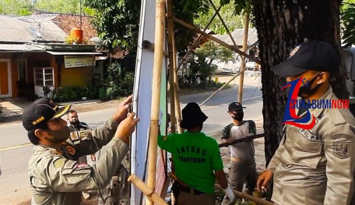 Sukabuminow.com || Alat Peraga Sosialiasi (APS) tiga Pasangan Calon Bupati dan Wakil Bupati Sukabumi tahun 2020 ditertibkan tim gabungan Panitia Pengawas Kecamatan (Panwascam) dan Satpol PP Kabupaten Sukabumi, Jumat (25/9/20).