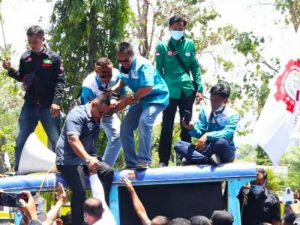 “Sebentar, sebentar. Bapak-bapak, saya ingin mempersilakan bapak-bapak untuk masuk ke dalam,” kata Yudha dari atap mobil komando.