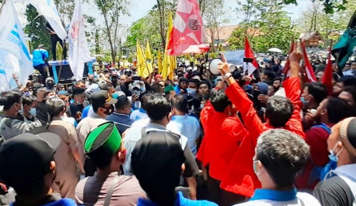 Ratusan massa tersebut menyuarakan aspirasinya berupa penolakan terhadap Rancangan Undang-undang Cipta Kerja (RUU Ciptaker) Omnibus Law.